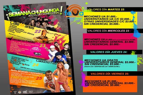 Cabe recordar que todas las fechas tienen valores de entrada: Mechones UA a $1.000 pesos, extranjeros (otras universidades) $3.000 pesos y sin credencial y publico general a $5.000 pesos.