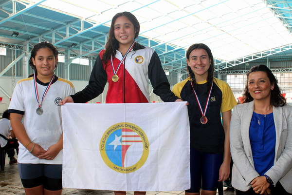 Tomka Buzolic del Colegio Binacional Chileno Norteamericano se llevó los 50, 100 y 400 metros libres y los 200 metros combinados; María Rivera de la Escuela “Juan Papic” ganó el oro en los 50 y 100 espalda; Renata Gómez se impuso en los 50 metros pecho y 100 metros mariposa e Isidora Delgado ganó los 50 metros mariposa ambas del Antofagasta International School (AIS); y Josefina Córdova del Colegio Chañares fue la mejor en los 100 metros pecho.
