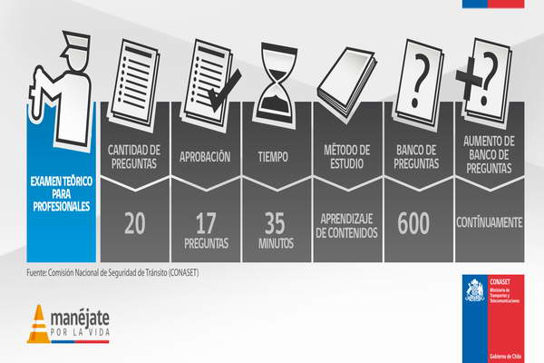 Con respecto al las características de este examen teórico para conductores profesionales, Jaime Valdebenito explicó que “el examen consta de 20 preguntas y cada respuesta correcta vale 1 punto. Se aprueba con un mínimo de 17 puntos de un máximo de 20, es decir, se aplica un 87% de exigencia. Se deben contestar las 20 preguntas que conforman el examen en un tiempo máximo de 35 minutos. Las preguntas se seleccionarán al azar de un banco de más de 600 preguntas”.