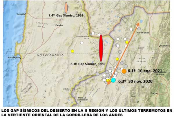 El experto declara que uno de estos GAP cuenta con un último gran registro en el año 1950, con un movimiento de 8. 3º magnitud, bajo la Cordillera de los Andes, en el sector Socaire. Situación que se repite en la zona adyacente a Calama, segundo GAP sísmico regional, que hace 67 años no experimenta un terremoto de 7.4º de magnitud.