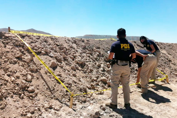 Detectives de la Brigada de Homicidios, junto a la Brigada Investigadora de Delitos Medio Ambientales y Contra el Patrimonio Cultural, además de peritos del Laboratorio de Criminalística, están investigando el origen de los restos humanos que fueron encontrados mientras se realizaban obras viales en la comuna de Sierra Gorda.