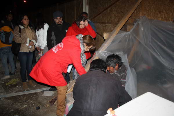 Posteriormente, en caravana se recorren los diferentes “rucos” de la ciudad. Los voluntarios, junto a los adolescentes, entregan comida, sopa, café y se les regala ropa de abrigo. Los denominados “rucos”, son los lugares que escogen estos habitantes para dormir, en que: con madera, cartón o plástico, fabrican una improvisada protección. Increíblemente, en Calama la mayoría, están emplazados en sitios eriazos colindantes con grandes empresas retail o supermercardos.