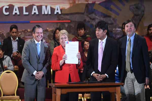 La Presidenta de la República, Michelle Bachelet, participó esta tarde en la ceremonia de presentación del Plan de Inversión para Calama realizada en el Teatro Municipal de la capital de la Provincia de El Loa. En la oportunidad, la máxima autoridad afirmó que “es una enorme satisfacción firmar hoy el decreto que establece el plan ‘Nuevos Tiempos’, que responde a demandas que durante largo tiempo los vecinos y vecinas de la ciudad, junto a sus autoridades locales, han planteado al Gobierno central”.