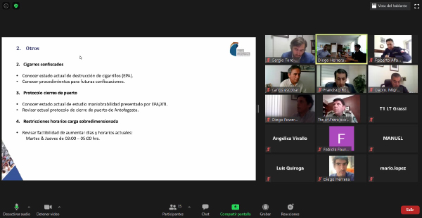 La sesión contó con la participación de autoridades representantes de la Gobernación Marítima, Capitanía de Puerto, Jefatura de Zona de Carabineros, Seremi de Salud, Brigada Extranjería PDI, Aduanas y SAG junto a ejecutivos de Puerto Antofagasta.