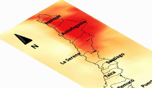 ¡Y claro! Si es en el norte de nuestro país donde más energía solar se recibe. En el mapa se observa en tonos rojos las ciudades que más radiación total reciben durante gran parte del año, lo que conlleva a riesgos extremos para la salud de la población puesto que los niveles de radiación UV-B son mayores también allí. Hacia el sur los valores se tornan más moderados y en Magallanes se alcanza un mínimo, lo que también puede provocar problemas puesto que se puede producir déficit de vitamina D.
