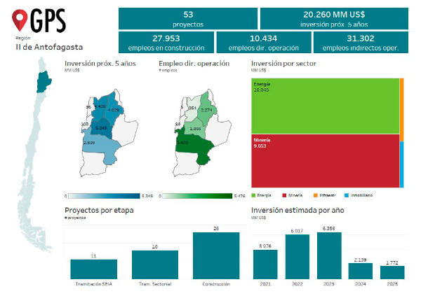 Dentro de lo destacado del informe, el mismo Seremi comentó que el área de energía que suma alrededor de US$ 10.045 MM posee la mayor inversión regional por sobre los sectores de minería e infraestructura. Mientras que, por la parte de empleo, la comuna de Antofagasta aglomera el registro mayor de empleo directo, sobre las 5.400 plazas, cuando los proyectos inicien operación.