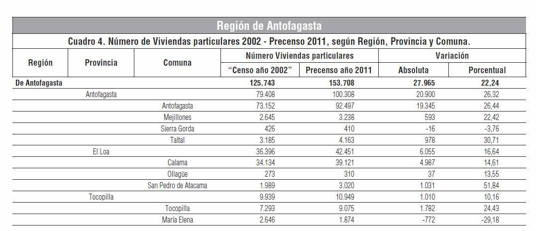 Asi se desprende que la comuna que ha desarrollado una mayor expansión en esta ultima década, es San Pedro de Atacama, que por sobre un 50% ha visto incrementada las viviendas particulares. Esta comuna es seguida por Antofagasta, con cerca de 20.000 nuevas viviendas, que representa un 26% mas al año 2002, Tocopilla con un crecimiento sustancial de 24% y Calama con mas de 6.000 nuevas viviendas, cuyo índice de crecimiento en esta categoría está cercano al 15%.