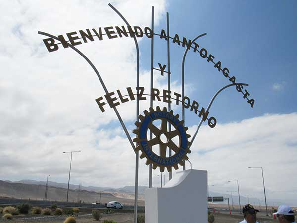 En una ceremonia realizada en el bandejón central que conecta el Aeropuerto Andres Sabella con la Ruta 1, miembros del Rotary Club Antofagasta, encabezados por su presidente Iver Fajardo y el representante de la Gobernadora del Distrito 4320, Guillermo Núñez, hicieron entrega de un monolito, elemento simbólico rotario que da la bienvenida a la ciudad a turistas y pasajeros que desembarcan en el principal terminal aéreo de la Región.