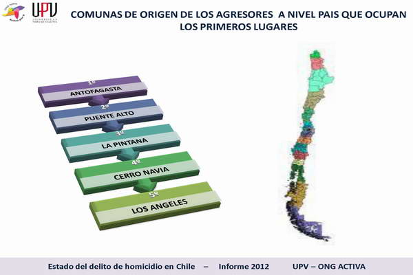 Según el estudio las principales comunas de origen de estos jóvenes son Puente Alto, La Pintana, Cerro Navia, El Bosque y San Bernardo, comunas en las cuales se ha registrado a su vez un aumento de los delitos asociados a tráfico de drogas, lesiones y violencia intrafamiliar, lo que en su conjunto favorece el desarrollo de conductas violentas más extremas como es el caso del homicidio.