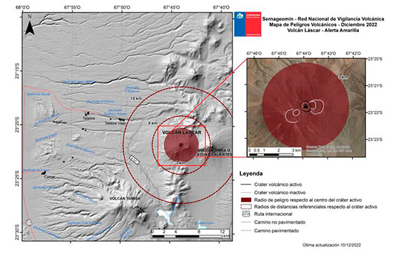 Durante esta tarde, la Oficina Nacional de Emergencia del Ministerio del Interior (ONEMI) junto al Servicio Nacional de Geología y Minería (SERNAGEOMIN) desarrollaron una mesa técnica mediante videoconferencia con las autoridades de la Región de Antofagasta, oportunidad en la cual el organismo técnico informó el cambio de la alerta técnica del volcán Láscar incrementándolo a Nivel Amarillo. El curso de acción anterior se debe a que, durante este mediodía y después del análisis instrumental reportado a través de su Red Nacional de Vigilancia Volcánica (RNVV), se generó una columna eruptiva de aproximadamente 6.000 metros sobre el nivel del cráter, con alta carga de piroclastos y dispersada hacia el Suroeste, y produciendo flujos piroclásticos de menor alcance hacia los flancos Norte y Sureste.