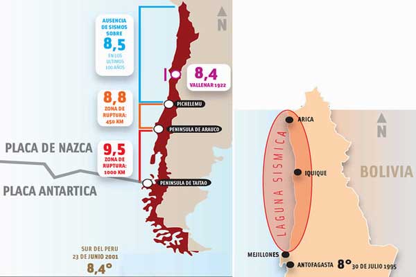 Este último dato también sustenta la hipótesis que ya no haya una sola “masa” de tierra que debe romperse, más bien hay dos en distintos tramos del norte grande, la primera desde el sur de Iquique hasta Perú y la otra, desde Patache hasta Antofagasta, pudiendo generarse dos terremotos juntos de gran envergadura, o uno solo, pero no es posible predecir este fenómeno.