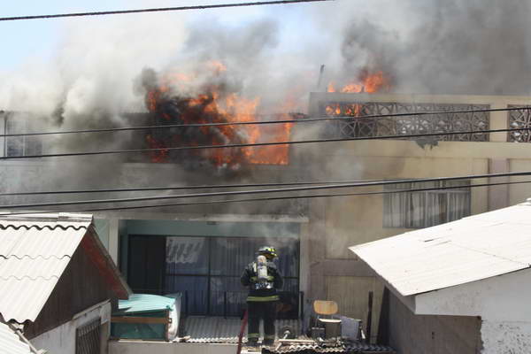 Bomberos de Antofagasta concurrió a las 12,41 horas hasta la intersección de Pedro Gamboni con Virgililo Arias, sector Gran Vía, donde una vivienda en su tercer piso era consumida por el fuego.