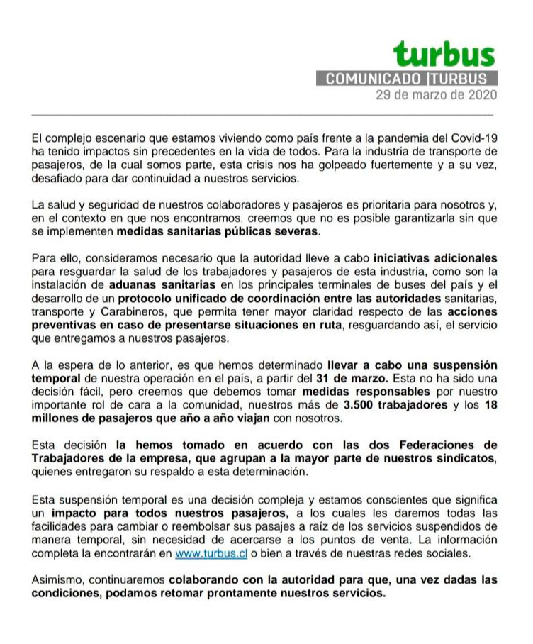 La empresa de buses Turbus anunció la suspensión indefinida de sus operaciones desde el próximo 31 de marzo, a causa del coronavirus.
