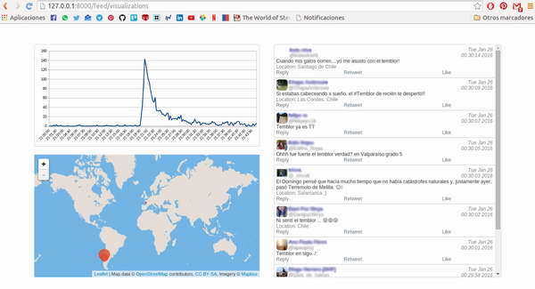 Los datos se mostrarán al CSN mediante visualizaciones. A través de una plataforma web se podrá observar una señal que registra la cantidad de tweets en el tiempo, un mapa en el que se marcaran los lugares desde donde los usuarios están twitteando y el posible epicentro -estimado a partir de la localidad en que se ubican los usuarios que reportaron primero el evento-, además de la lista de tweets recolectados en forma de timeline.
